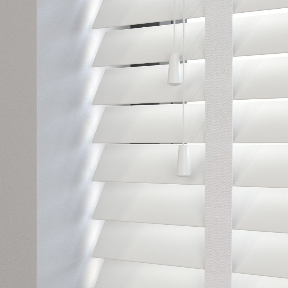 Part of the ever-popular Editions range, Satin White with Jasmine White Tapes features a faux wood with a gentle sheen complemented by diffuse white ribbons streaming vertically. A gentle woodgrain effect beautifully imitates the effect of premium basswood, to give the impression of real wood slats. Durable and water-resistant PVC makes this blind a superb option for high-wear rooms such as kitchens and bathrooms.
